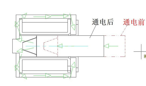 推拉式電磁鐵中間的滑動(dòng)鐵芯,線圈通電后產(chǎn)生磁場(chǎng),磁場(chǎng)將鐵芯磁化,鐵芯形成疊加磁場(chǎng),磁力線由一極向另一極運(yùn)動(dòng)時(shí)產(chǎn)生力,鐵芯的一端可以帶動(dòng)一個(gè)物體做位移運(yùn)動(dòng),進(jìn)而實(shí)現(xiàn)一個(gè)功能動(dòng)作。